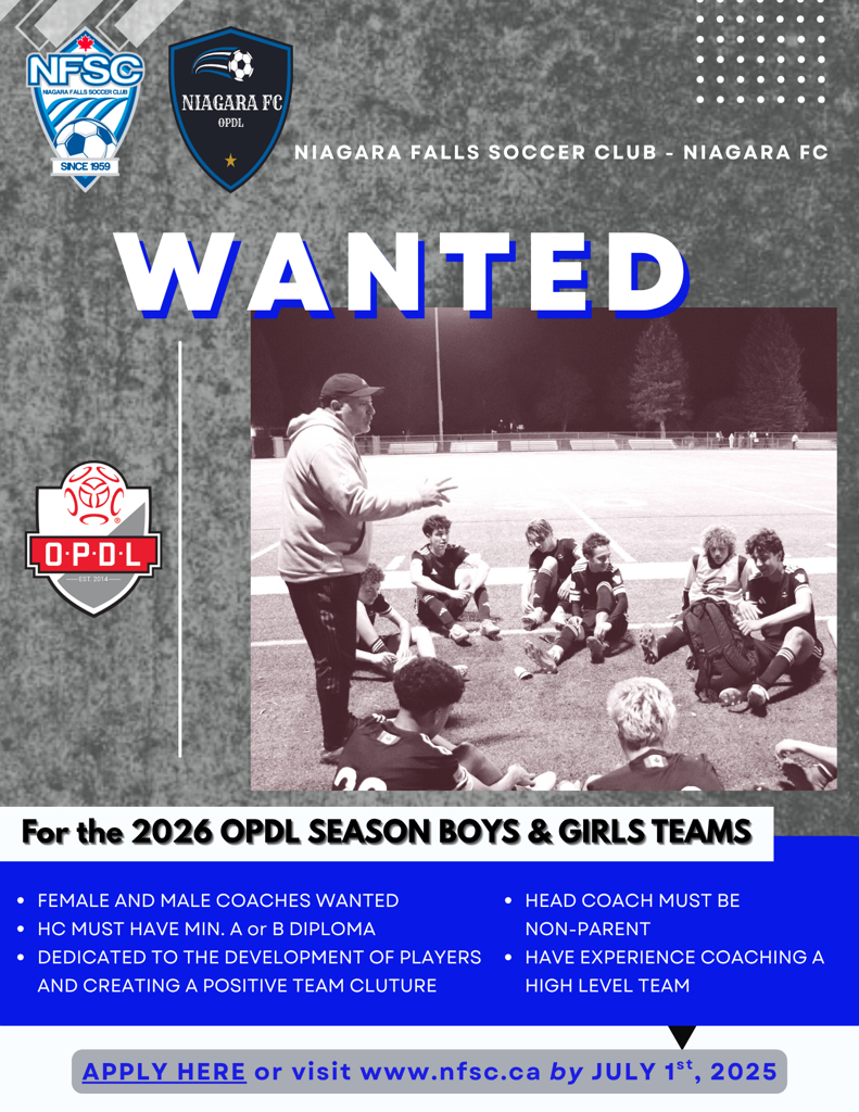 NFSC – NIAGARA FC OPDL is now accepting coaching applications for the 2026 season for both Girls and Boys programs (U13 to U17).